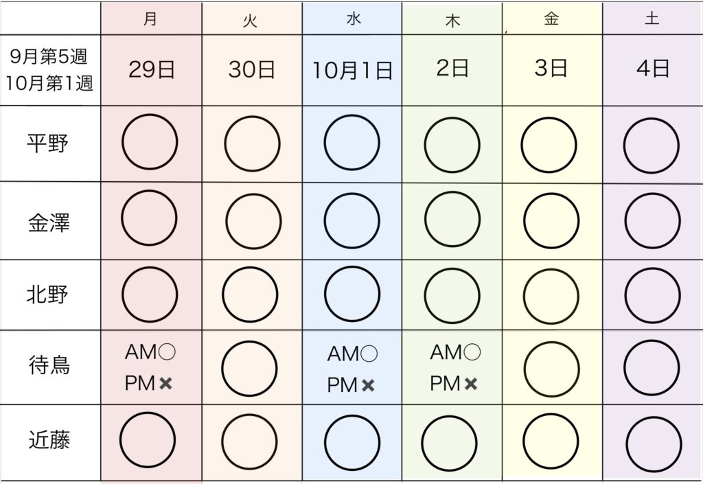 ※都合により急遽変更になる場合がございます。また、担当が不在の場合は物理療法のみ(電気など)になる事があります。あらかじめご了承ください。