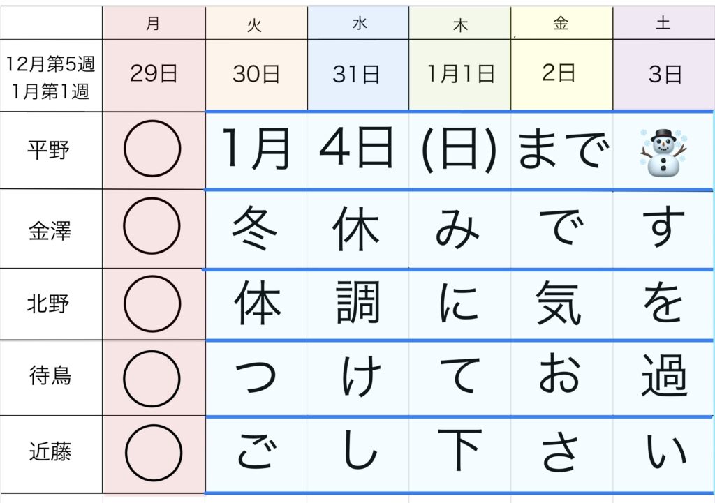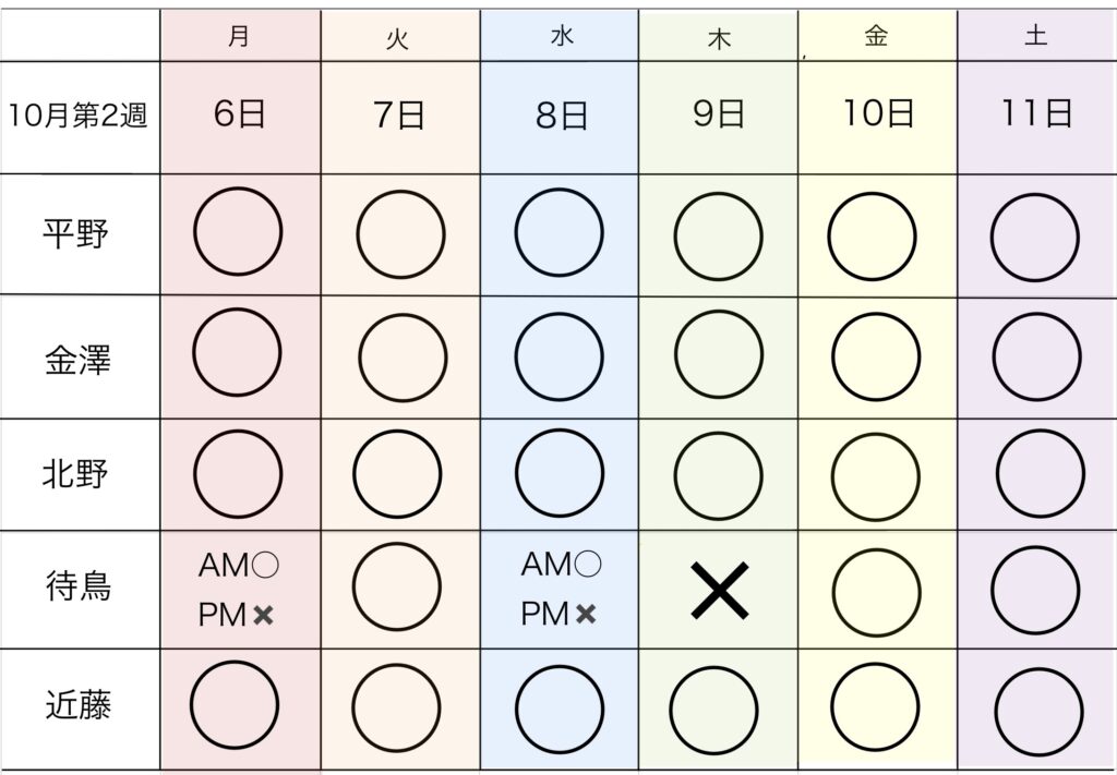 今週のリハビリスタッフ勤務表