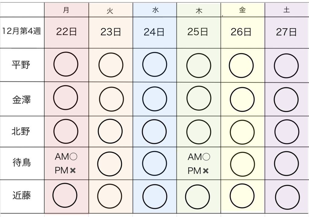 ※都合により急遽変更になる場合がございます。また、担当が不在の場合は物理療法のみ(電気など)になる事があります。あらかじめご了承ください。