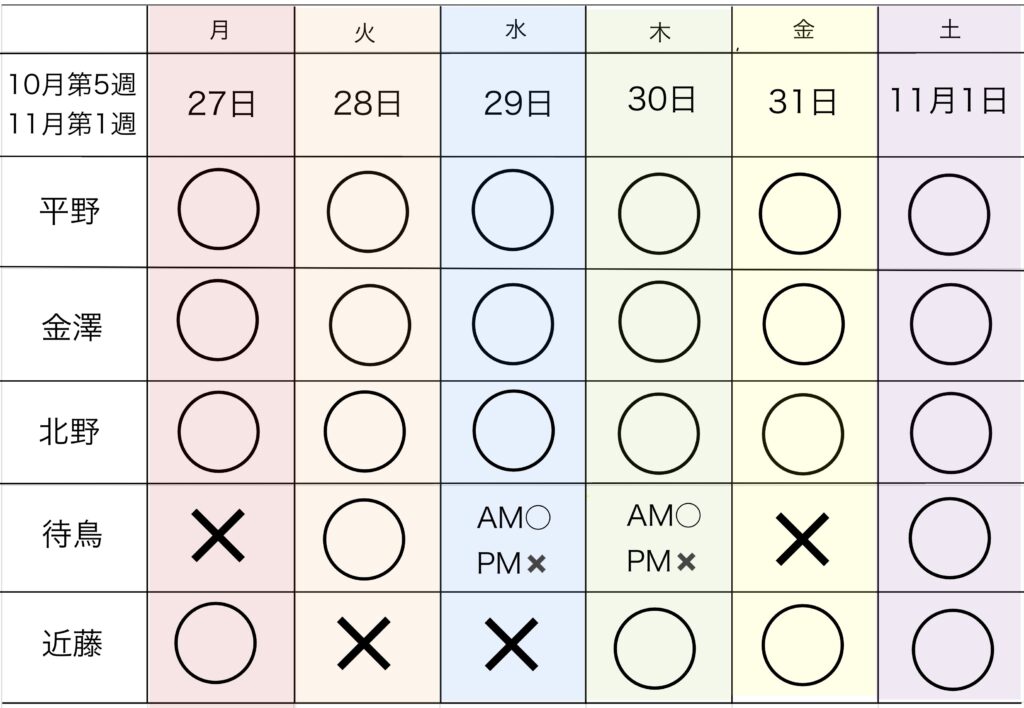 ※都合により急遽変更になる場合がございます。また、担当が不在の場合は物理療法のみ(電気など)になる事があります。あらかじめご了承ください。